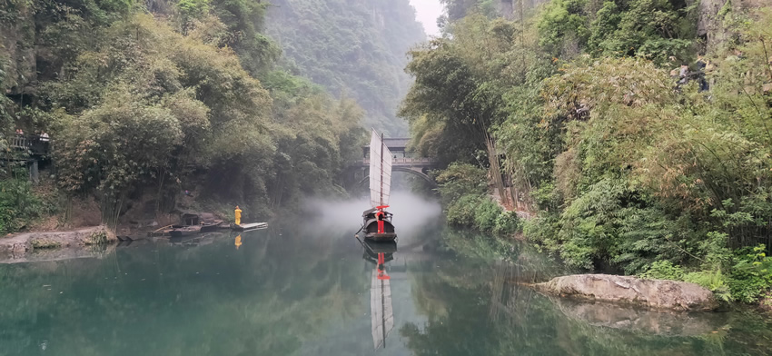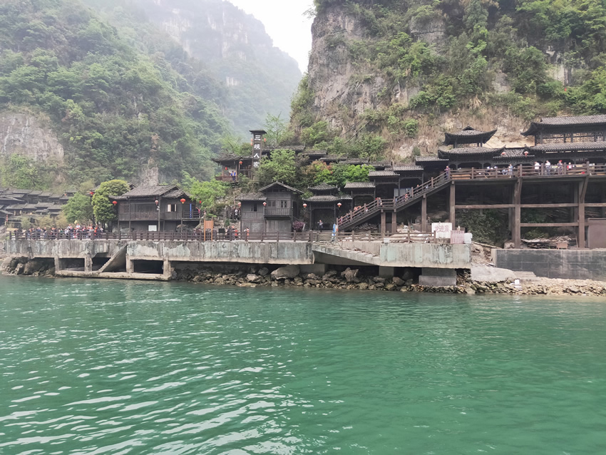 下船第一站-當(dāng)陽頭碼頭,這里是游客中心,有很多餐館,我們跟隨導(dǎo)游吃過飯后便前往第一個(gè)景點(diǎn)-水上人家。穿過售貨長廊,便看到了龍進(jìn)溪:正對(duì)溪口的江北山崖上,一條帶狀石嶺從山頂蜿蜒而下,快臨江時(shí)向上高高翹起如一條巨龍,龍頭所向,像要跳進(jìn)南岸的清溪內(nèi),龍進(jìn)溪因此而得名。岸邊幾只古帆船迎風(fēng)而立,纖夫們?cè)诮泻爸H為熱鬧。這里溪水清綠,林木蒼翠,不遠(yuǎn)處還有土家族打扮的紅衣姑娘撐著紅傘站在船頭,后面還有人工制造的仙氣圍繞,真的是“龍溪橋下春波綠,驚鴻拂面照影來”。