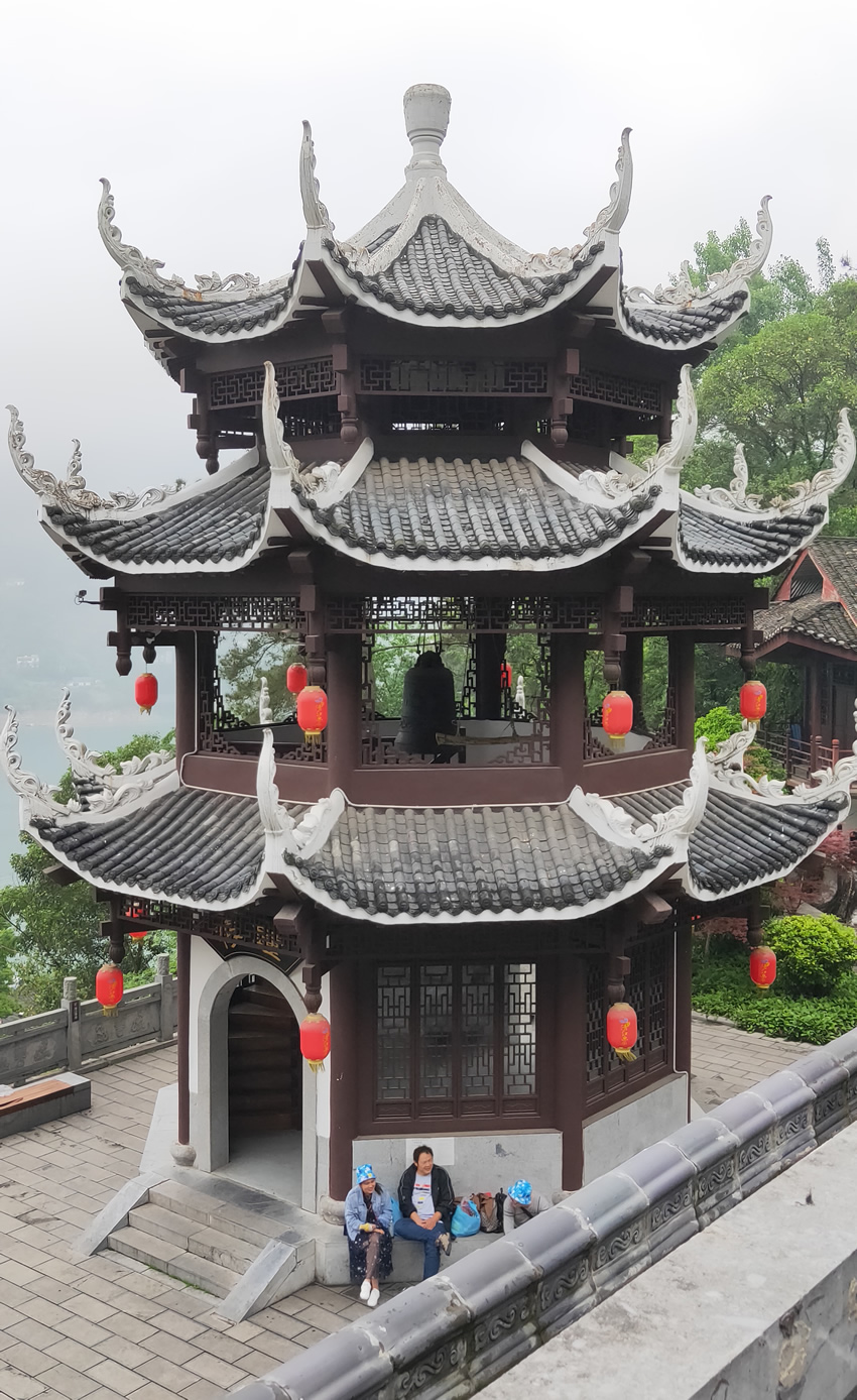 之后我們返回當(dāng)陽頭碼頭登船前往燈影閣碼頭,乘坐扶梯去往巴王寨。巴王寨是用石頭、原木和泥土作為原材料建筑而成,記錄并呈現(xiàn)了一個(gè)民族從興盛到衰弱的歷史過程,沿路看到磨石、雕刻等具有農(nóng)耕風(fēng)情的巴人生活,古色古香。然而老天下起了雨,大家狼狽前行,錯(cuò)過了燈影石的好風(fēng)光。不過有兩位穿著巴人服飾的大叔在雨中駐守于巴王宮外,繼續(xù)扮演他們的“角色”,相當(dāng)敬業(yè)。巴王宮內(nèi)刀槍劍戟擺在中堂兩側(cè),一股肅殺之氣沖天而起,巴王端坐在殿中,旁邊是巴王女兒。雖然這是人造的仿古景點(diǎn),但似乎有那么點(diǎn)意思。聽另一位導(dǎo)游說,如果不下雨的話,每天都會(huì)有古巴人風(fēng)情的仿古舞蹈表演,很好看,不禁感到遺憾。不過我們還聽了蘭曲,看了十分鐘的女書小劇場,各有特色。