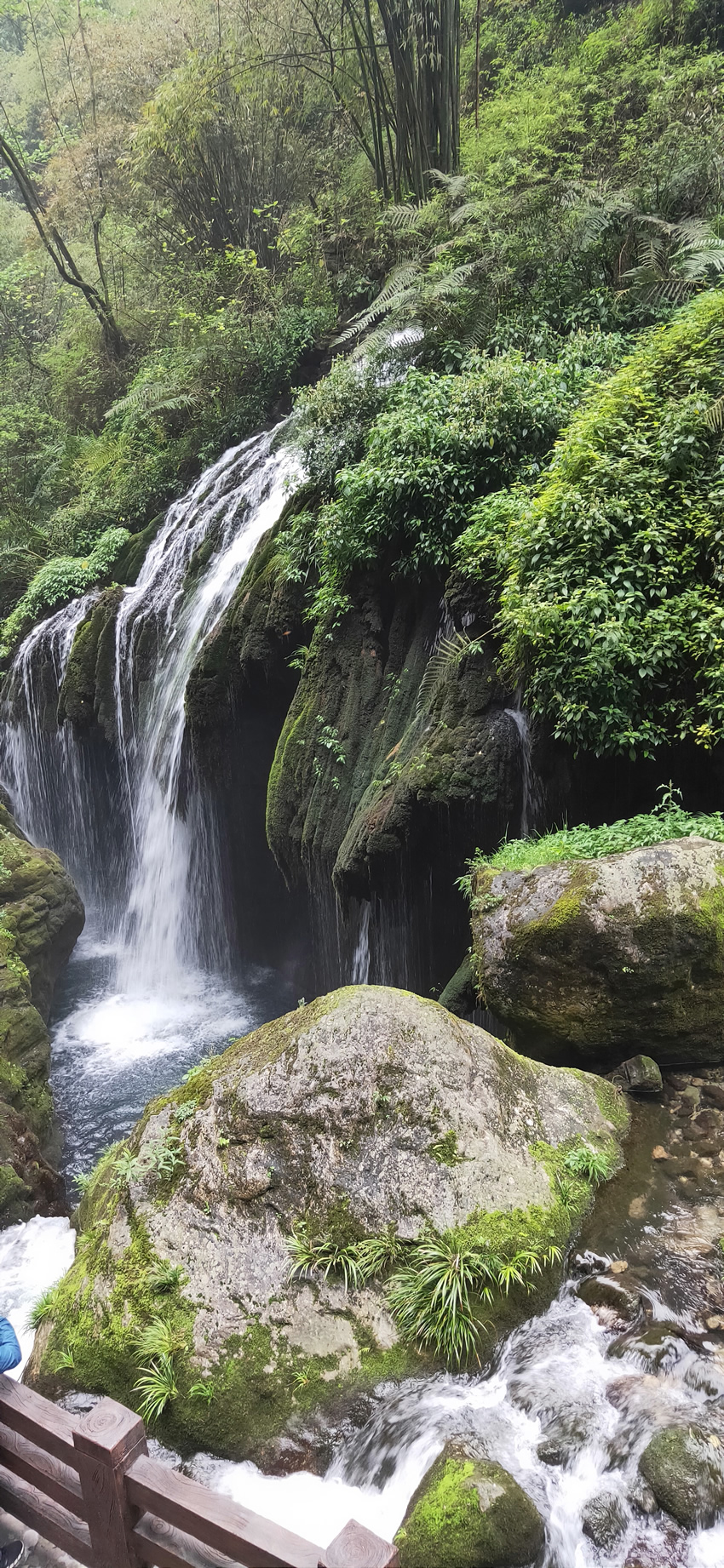 這里一半著陸,一半入水,青山綠水之間,景色如畫。一路上能看到溪里的小魚、小鵝,溪邊洗衣服的大嬸和蕩舟的幺妹子,還有衣著古風(fēng)的美女在閣樓里彈琴,盡顯當(dāng)?shù)叵先思业娜粘I睢=又覀儊淼搅恕谤o橋”,婚嫁表演的閣樓,可惜當(dāng)時(shí)站在閣樓最左側(cè),未能完全觀賞。印象最深刻的是男扮女裝的媒婆,拿著一個(gè)大煙桿左右搖擺地走下來,整個(gè)表演比土家打扮的姑娘們細(xì)致、入戲得多,哈哈。最后是黃龍瀑,水流從對(duì)面山崖一個(gè)山洞流出,呈扇形展開,傾瀉而下,匯入崖下的深潭,水聲如雷貫耳,響徹山谷,讓人神清氣爽,忍不住留念合影。