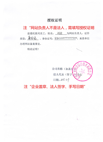 5、網(wǎng)站備案授權(quán)書(法人簽字,加蓋公章)( 注:當(dāng)網(wǎng)站負(fù)責(zé)人與法人為同一人時,不需要此表)點(diǎn)擊下載